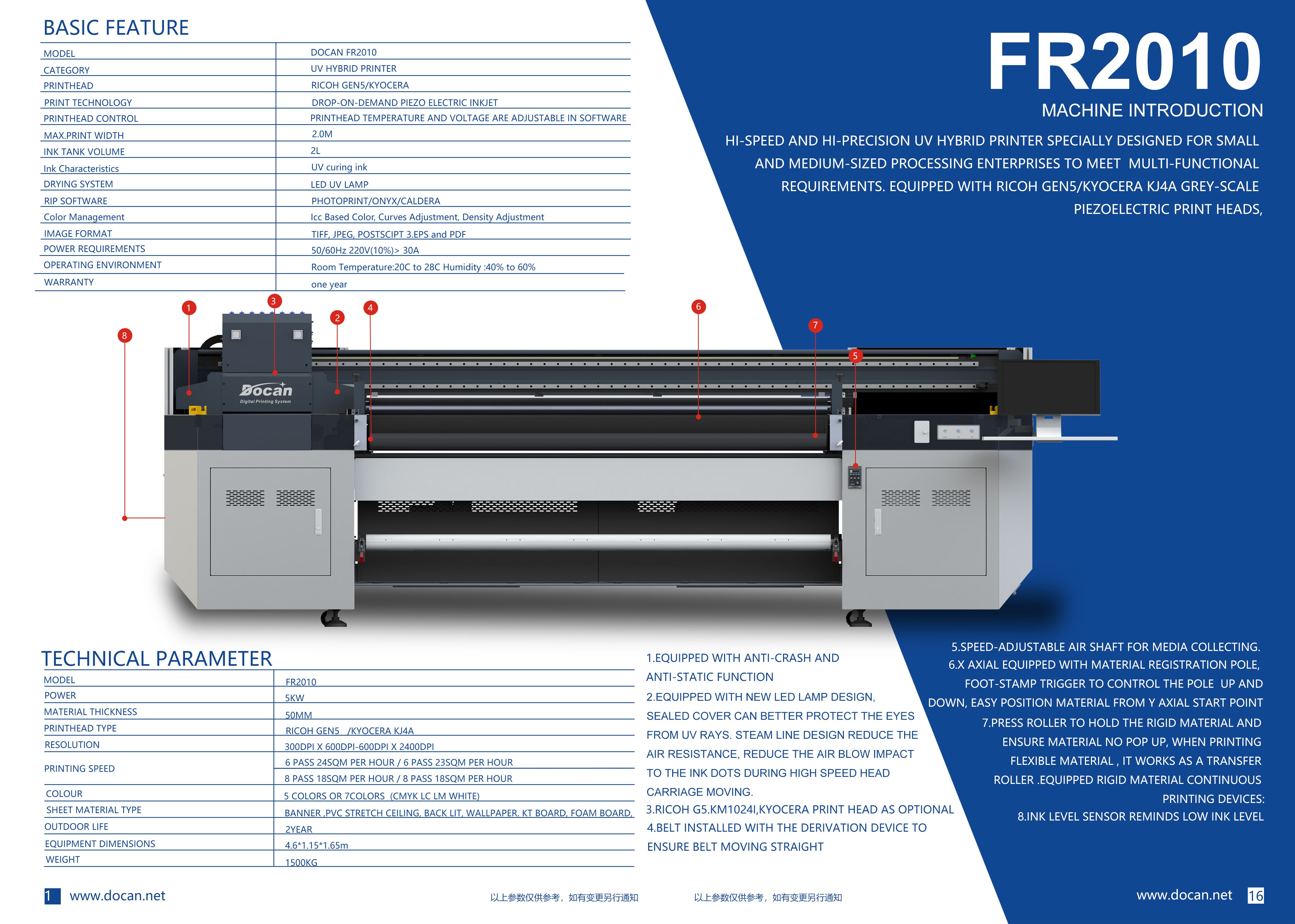 ספינת הדגל של Docan בקטגוריה ההיברידית היא ה UV FR2010 מכונה זו היא מכונה היברידית קומפקטית בעלת רוחב הדפסה נטו של 2.00 מטר ואורך ללא ההגבלה תודות למסוע וואקום חזק , המכונה מצויידת בראשי הדפסה Richo Gen 6 או KN1024i ויכולה להדפיס על מדיות עד גובה של 6ס"מ.